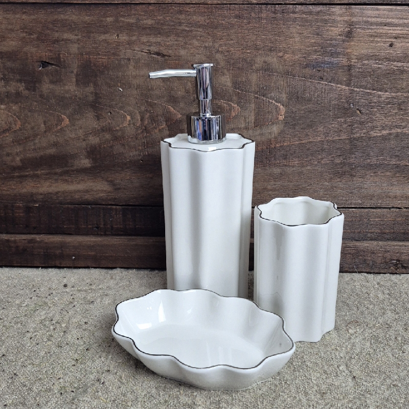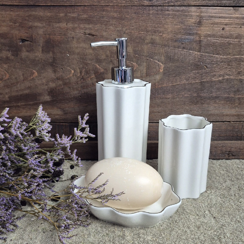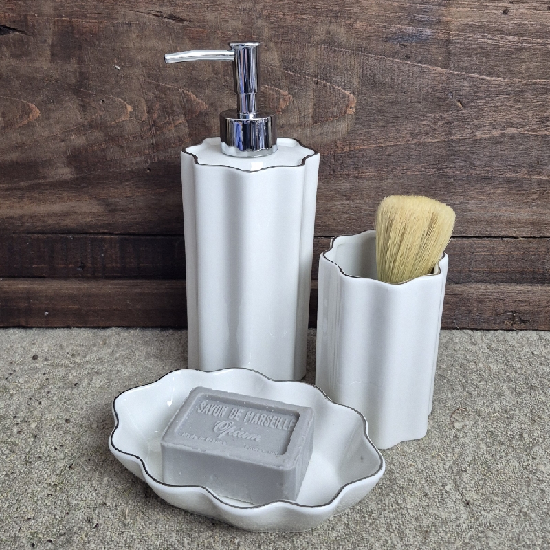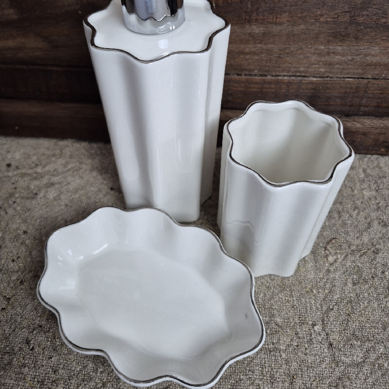 Schep orde in je badkamer of keuken met deze set van zeeppompje, zeepbakje en tandenborstelhouder die ook gebruikt kan worden als bv scheerzeepborstel of afwasborstel. In het zeeppompje kun je ook bv lotion in doen.