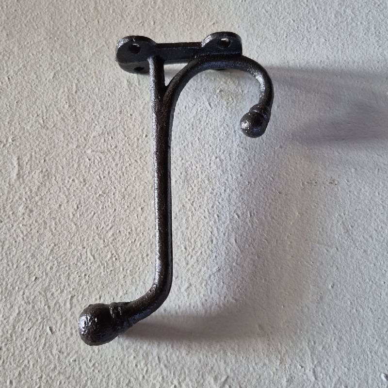 Smeedijzeren jashaak. Leuk om zelf een kapstok mee te maken. je kunt deze ook afwisselen met de kleine soort. Afm: 7x3x15cm. Kleur: zwart