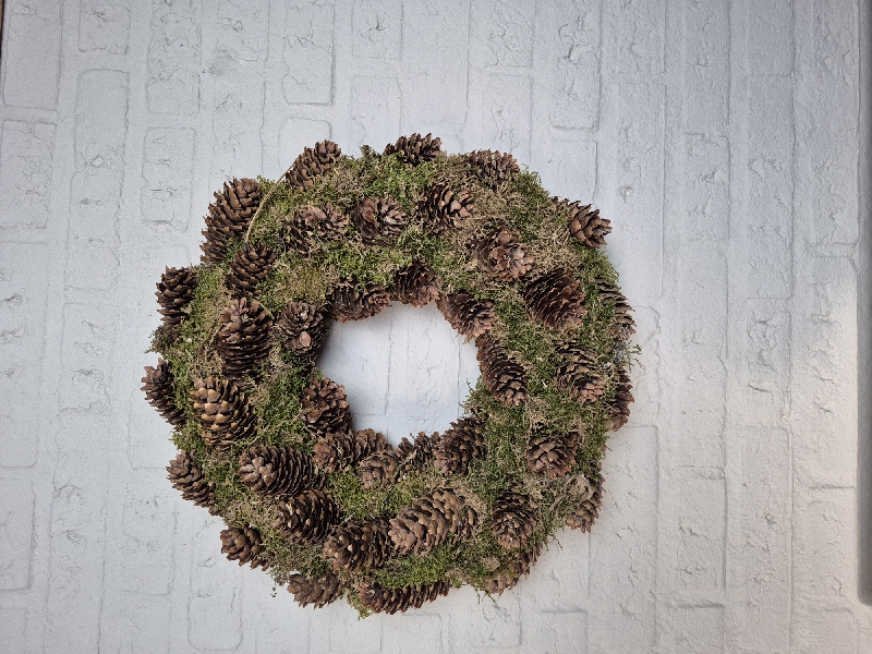 Prachtige moskrans met dennenappels. Robuust en sober aan de muur of met sfeerlicht op schaal. Afm: Ø 40cm 12cm dik.