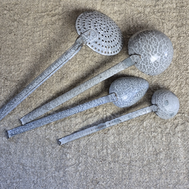 Leuke set van emaille pollepel, schuimspaan, opscheplepel, sauslepel. De kleuren matchen niet helemaal wat het juist leuk maakt.