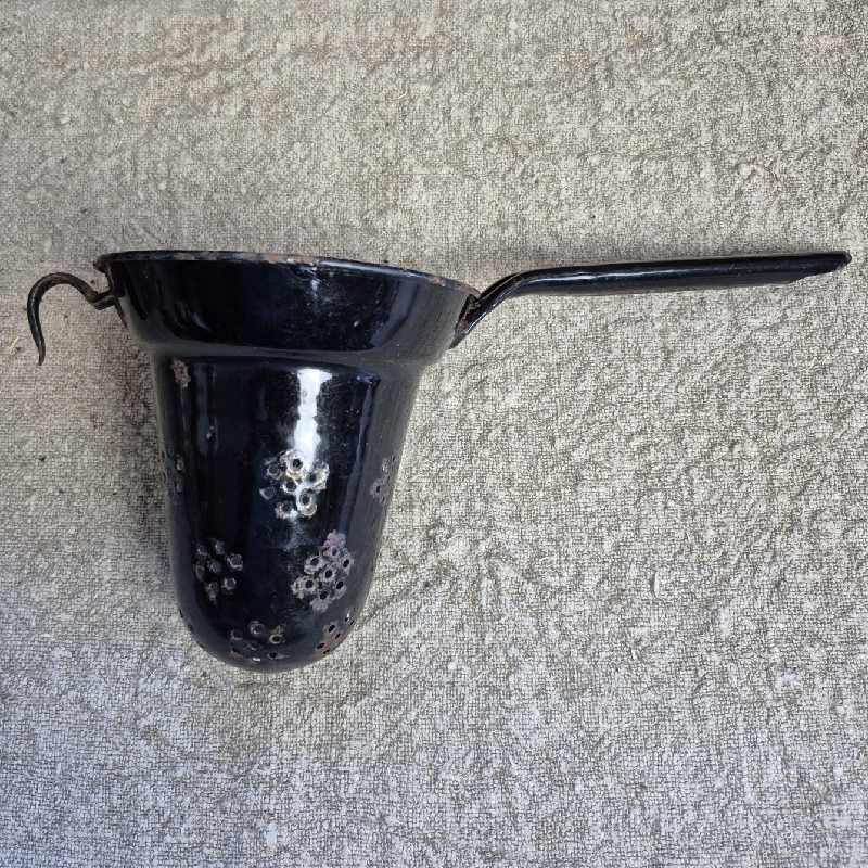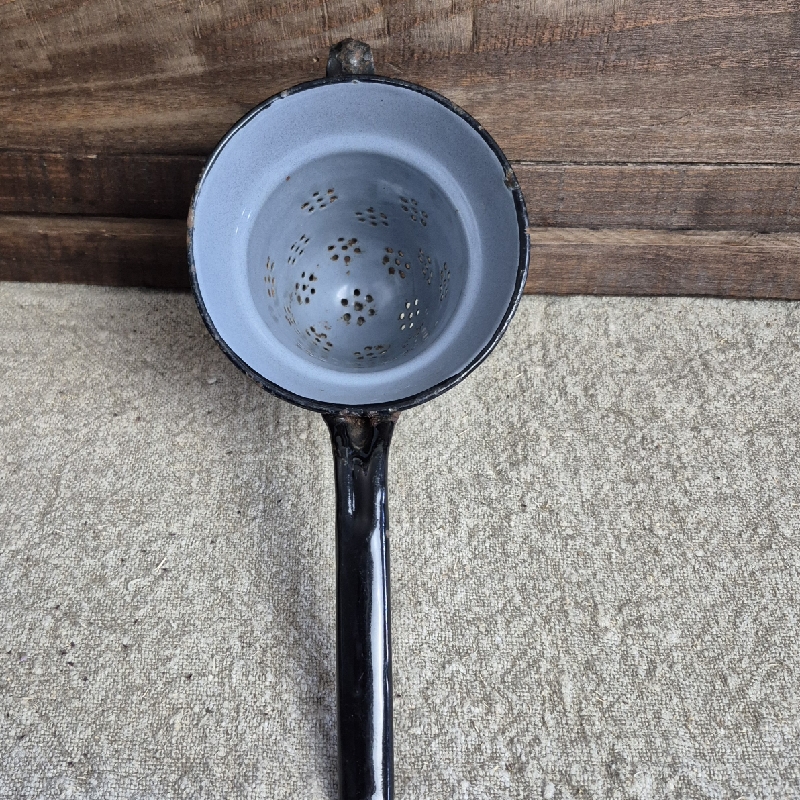 Oud emaille steelvergiet vanbinnen blauw en vanbuiten zwart.