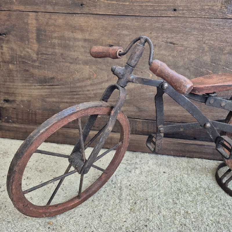 Oud fietsje van hout en metaal.