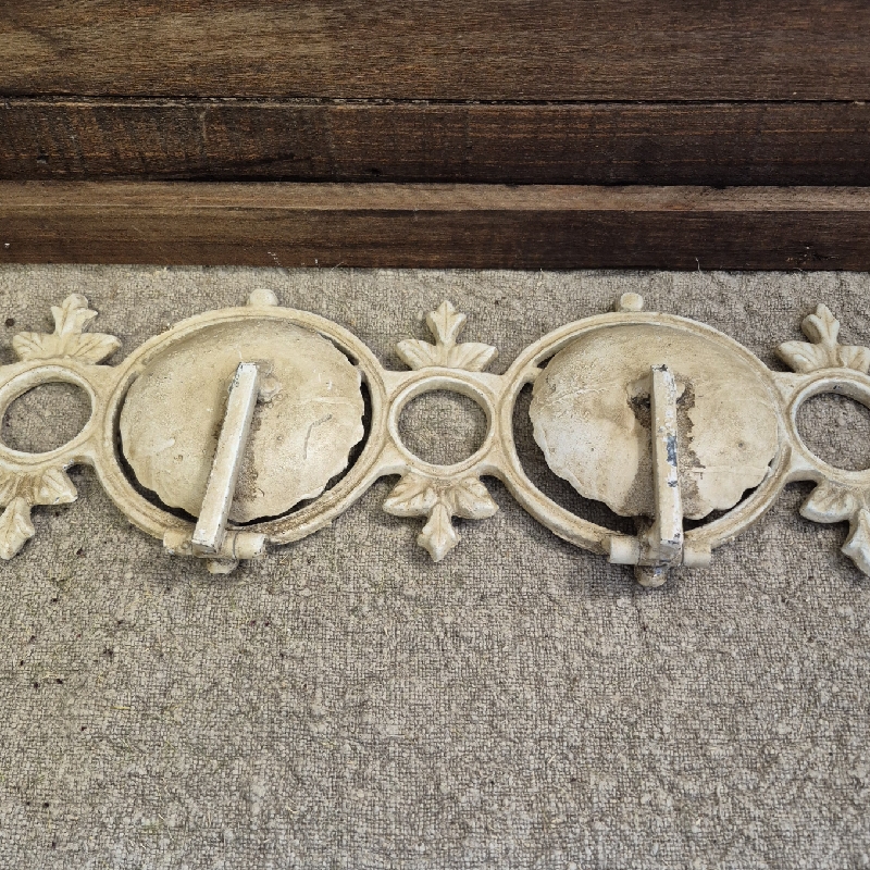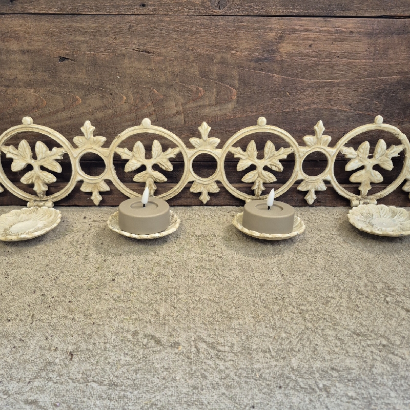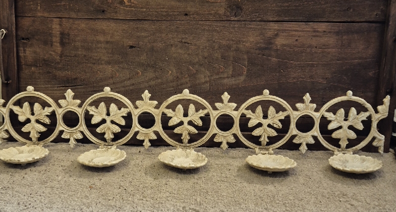 Oud gietijzeren rek met vijf uitklapbare schotels. Leuk voor aan de muur met waxinelichtjes. Afm: 77x14.5x12cm.