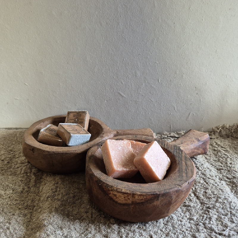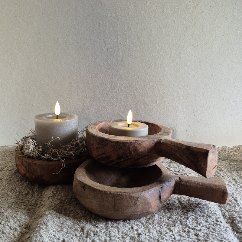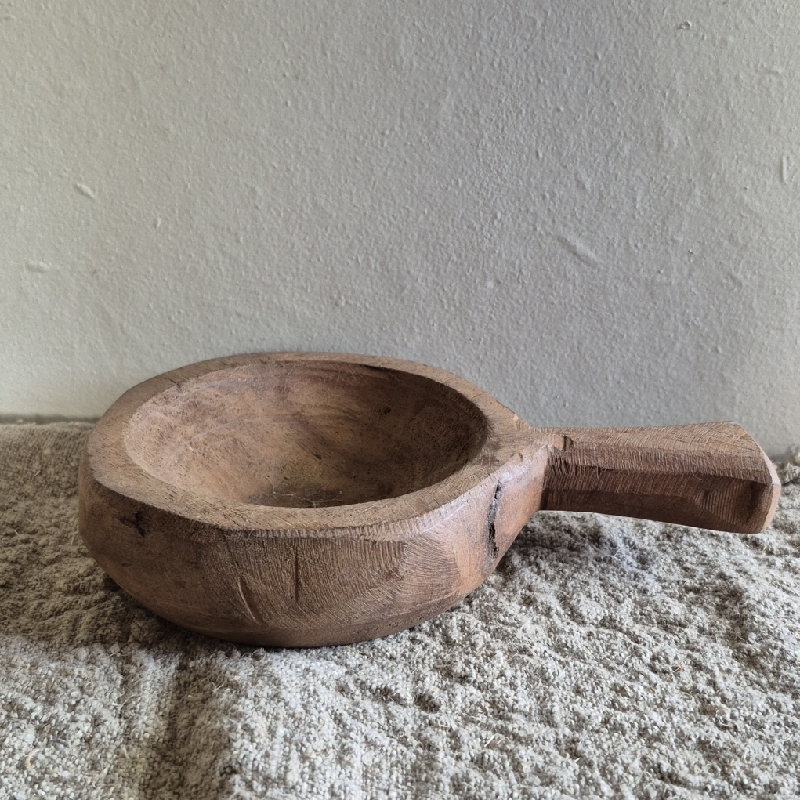 Oud houten kom met handvat, leuk om er een kaars in de zetten of lekker met geurblokjes. Afm: 15x22x4.5cm.