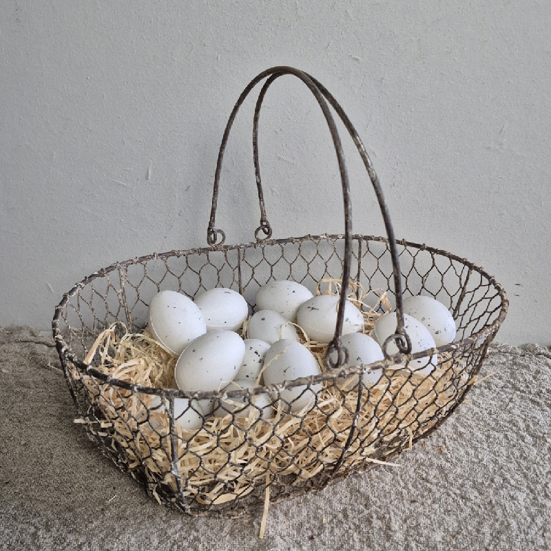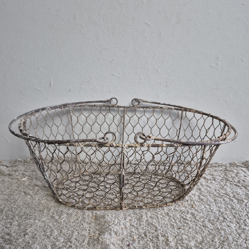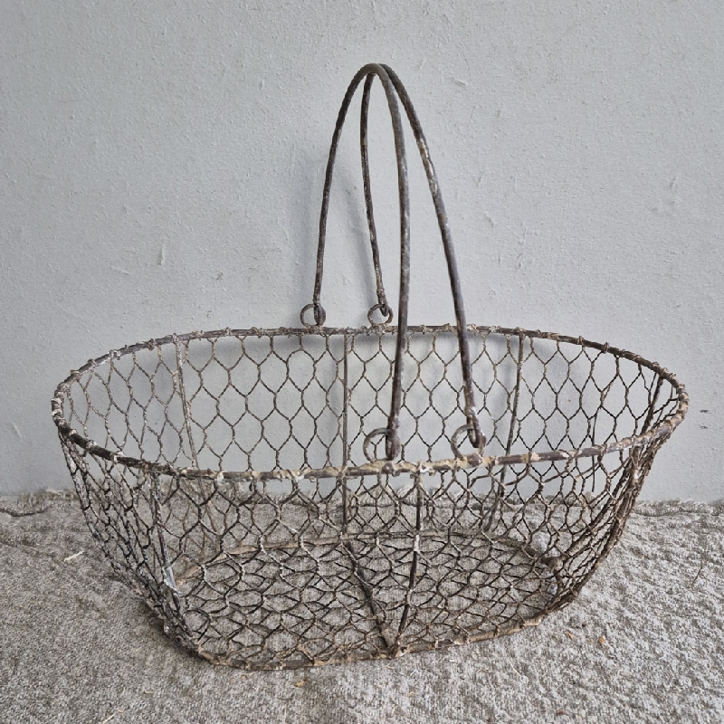 Oud mandje kippengaas met verweerde uitstraling. Leuk in je keuken met uien, eieren, kruidenplantjes of wat dan ook te gebruiken. Afm:30×21×14×27cm.