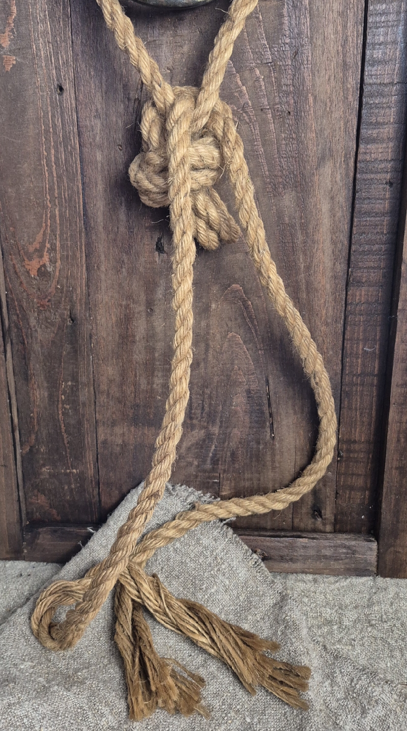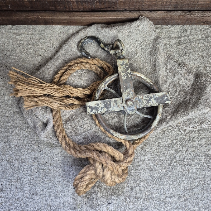 Oude katrol met haak en touw.