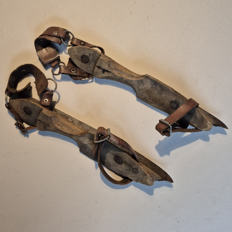 Oude houten schaatsen van de fabriek GS Ruiter uit Akkrum. Ze hebben gebruikssporen maar zijn leuk om te gebruiken als decoratie. Lengte: 33 cm.