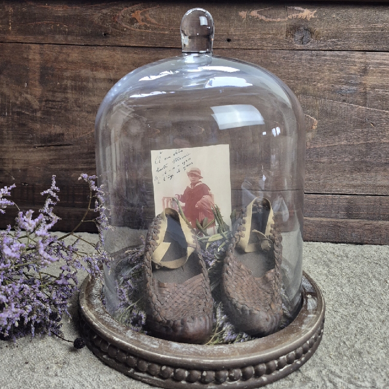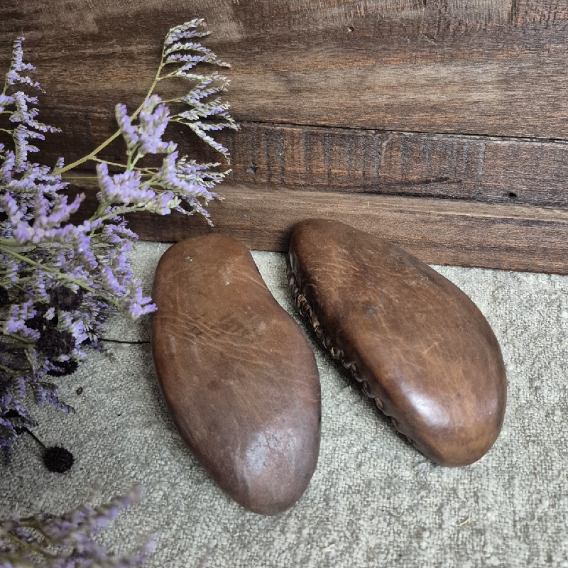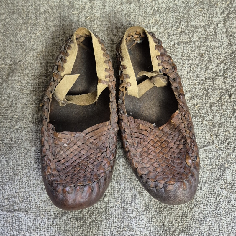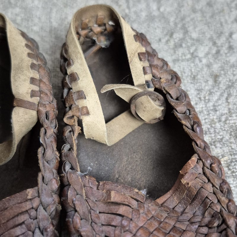 Oude gevlochten schoentjes van leer. Het leer is hard geworden. Lengte van de schoentjes 15cm. Leuk in een brocante interieur of onder een stolp.